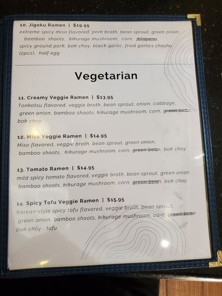 Extremely spicy miso flavored,veggie broth,bean sprout,green onion,bamboo shoots,mushrooms,corn,bok choy,tofu,black garlic oil,fried garlic