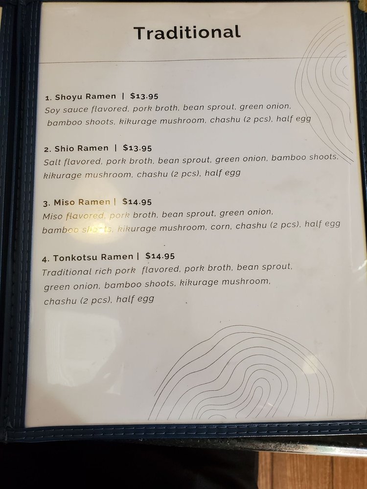 Salt flavored, pork broth,bean sprout, green onions bamboo shoot, kikurage mushroom, 2pcs chashu,half egg