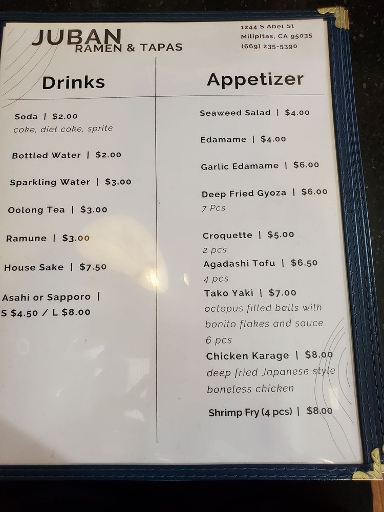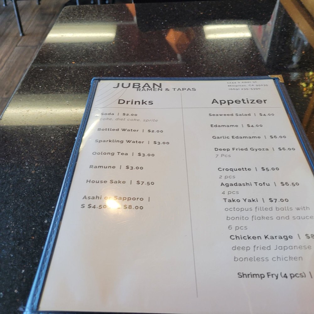 Juban Ramen & Tapas is a cozy gem in Milpitas offering a delightful menu of tapas and ramen dishes. With a focus on vegan and vegetarian options, the restaurant caters to a variety of dietary preferences. Customers rave about the flavorful broth, selection of vegetable-based dishes, and attentive service. The black garlic ramen and tonkotsu curry ramen are highlighted as must-try items, along with the crispy takoyaki appetizer. The small, intimate setting adds to the charm, making it a perfect spot for a casual lunch or dinner. Overall, Juban Ramen & Tapas provides a memorable dining experience with quality food and friendly service.